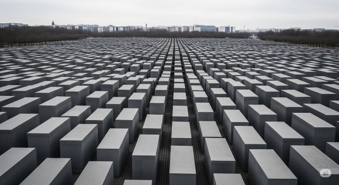 อนุสรณ์สถานกลางกรุงเบอร์ลินที่สร้างขึ้นเพื่อรำลึกถึงชาวยิวกว่า 6 ล้านคนที่เสียชีวิตในเหตุการณ์ Holocaust พื้นที่ปูด้วยแท่งคอนกรีตกว่า 2,700 แท่ง สื่อถึงความสับสน สูญเสีย และความทรงจำที่ไม่ควรถูกลืม